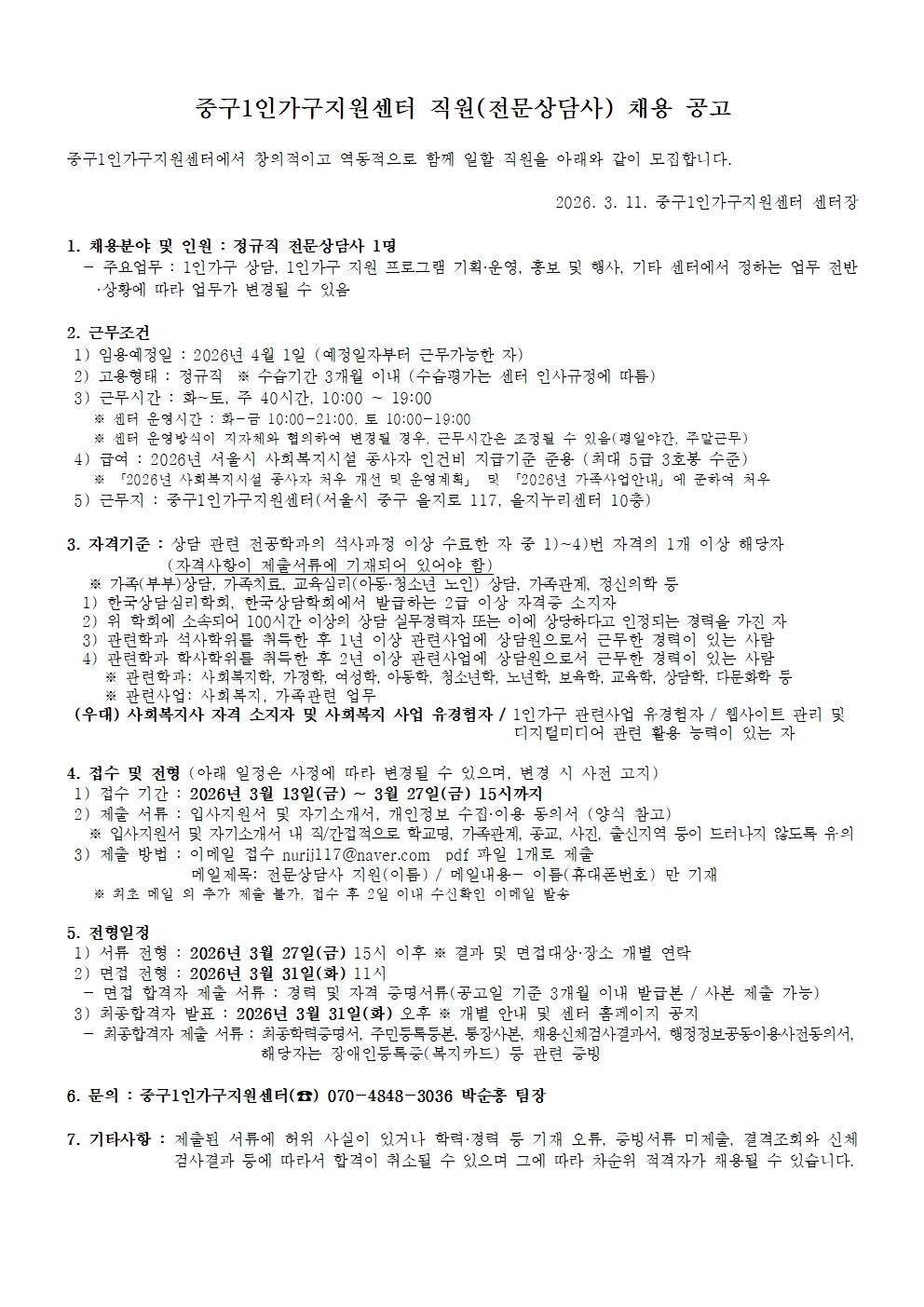 중구1인가구지원센터 직원(전문상담사) 채용 공고